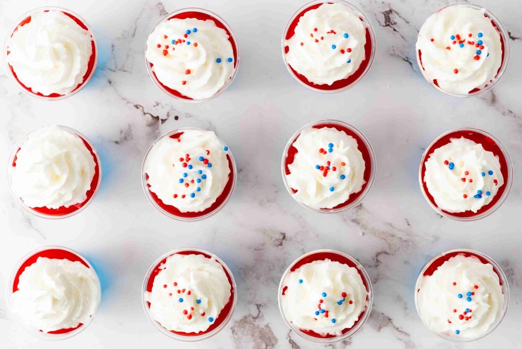 - Just before serving, top each shot with whipped cream and patriotic sprinkles.