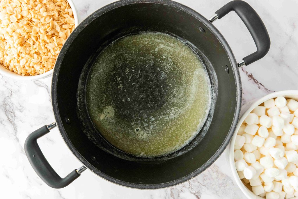 - In a large pot, melt the butter over low to medium-low heat. (For a deeper, richer flavor, try lightly browning the butter before adding the marshmallows.)