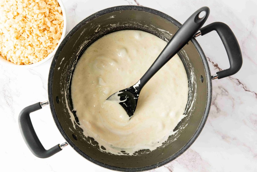 - Remove from heat and quickly stir in the Rice Krispies cereal along with a small handful of extra whole mini marshmallows for added chewiness.