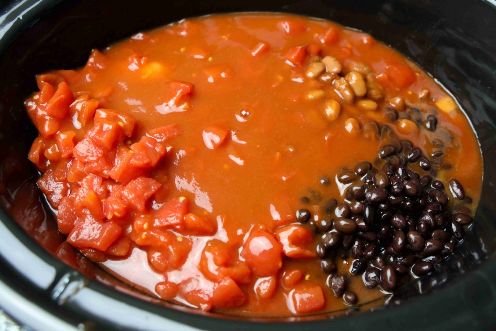 Place chicken breasts at the bottom of your slow cooker. Add the sautéed onions (and garlic), followed by corn, black beans, chili beans, diced tomatoes, and enchilada sauce. Pour in the chicken broth.