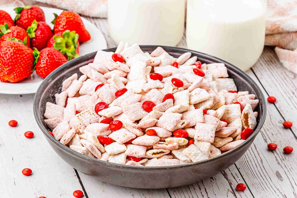 This batch has two coated cereals: one dusted in powdered sugar and one dusted in strawberry cake mix. When you toss them together with red M&Ms, you get that Valentine look without needing a ton of add-ons.
